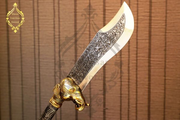 Specialities – Hand Engraved Floral Pattern on the blade, the Shaft, and a Stylized Elephant Head attached to the blade.