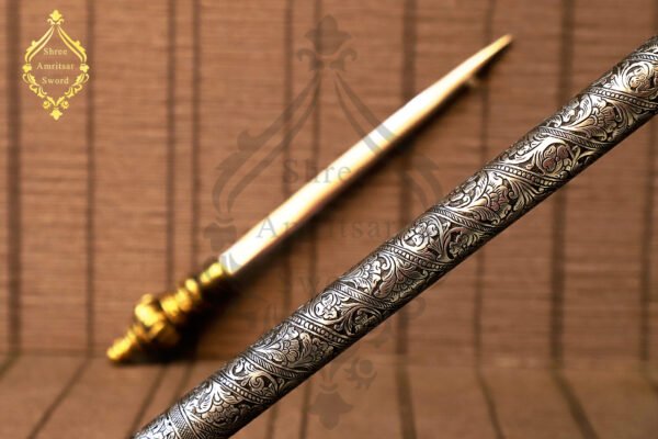 The Bhuj from Shreeamritsarsword.com is a beautifully crafted, rare 19th-century weapon from Gujarat, featuring a hand-engraved spiral shaft and floral blade. With its brass elephant head pommel and hidden weapon, this unique axe-knife is a stunning and historically rich addition to any collection.