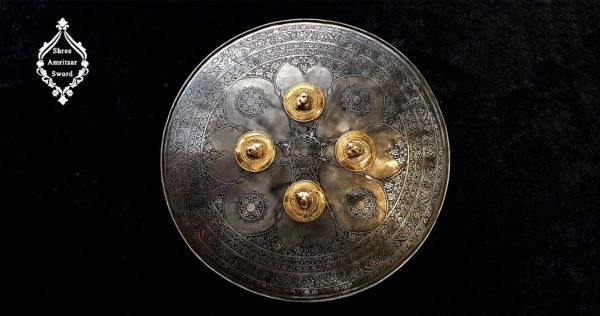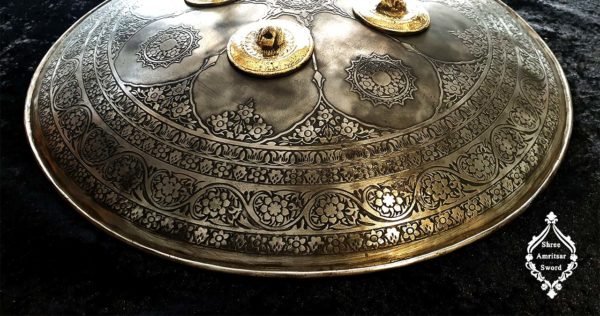 Made from iron with engraving on it, this dhaal / shield is decorated with 4 brass bosses making a remarkable piece for decoration. Its antique look adds an exceptional touch to this piece. Admirable, Adorable these words are perfect for such beauty. The size of this shield is 48 cms ( 19 inches) in diameter. The inner side is wrapped with velvet cushioning and strips to hold the shield. This shield is available in 3 different color variations Copper, Bronze, and Iron. To place an order kindly fill the inquiry form and we will get in touch with you soon.