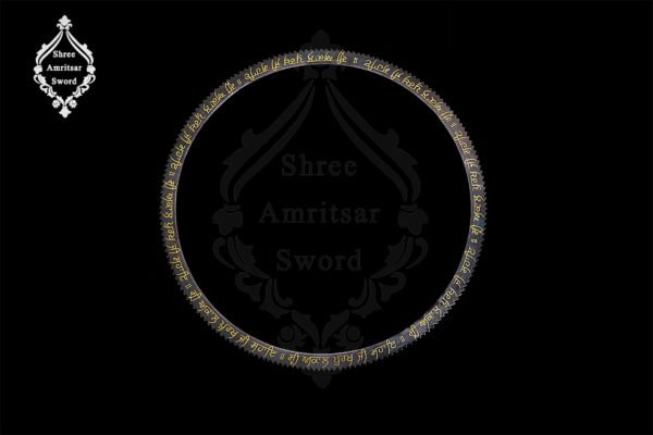 Dumala Chakar was used as a throwing weapon like a disc in warfare. They were widely used by the Sikhs in warfare. Chakra’s sharp edges would give deep wounds to the enemy and sometimes even cut the throat. They were adorned by the Sikhs on their Turban or Dumalas (Big size tomb style turbans tied by Nihung Singh’s) to defend their head from enemy attack. This Dumala Chakra/ Chakram is made of steel 8 inches in diameter and flounced with sacred calligraphy from Sikhism in 24kt pure gold wire inlay work. On one side we have written “Deh Shiva Bar Mohe Eha” and on the second side, we have written: ” Shri Akaal Purakh Ji Sahaye” In Gurmukhi Language. An astounding piece of art to complete your assemblage. To place an order kindly fill the inquiry form.