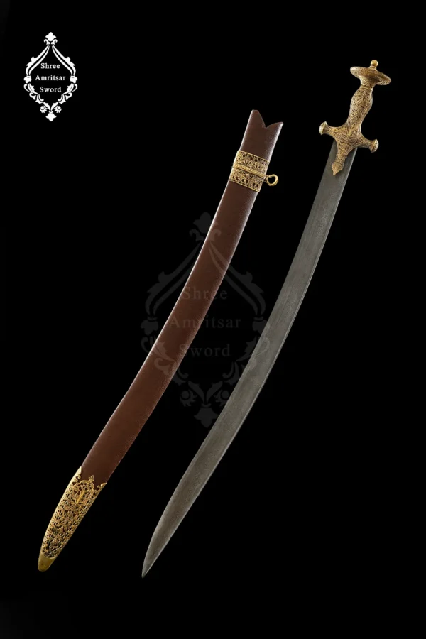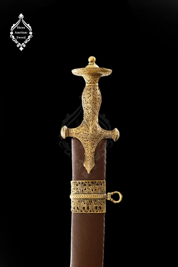 Additionally, the sword features a solid brass hilt, which adds historical character and ensures a firm, comfortable grip. The wooden scabbard wrapped in genuine leather complements the blade beautifully while offering reliable protection. Since artisans handcraft each piece, subtle variations enhance authenticity and exclusivity. Therefore, this sword stands out as a meaningful ceremonial and collectible item.
