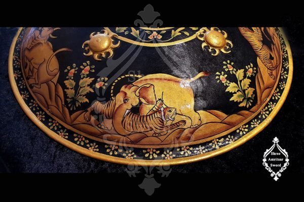 Dhal is the native name of a shield in the Indian language. It’s used by the warrior to protect himself from the attacks of a weapon in the battle. This Shield or dhaal is made of steel, 18 inches in diameter, and wrapped in genuine leather. A layer of pure gold leaves is pasted on leather and painted with oil colors to highlight the images. This shield depicts 4 hunting scenes of the tiger with different animals. All the 4 bosses of the shield are also covered with gold leaves. Grips and cushion on the backside to hold the shield are also made of leather. An artistic production to decor the wall of your office or home. To place an order kindly fill the inquiry form.