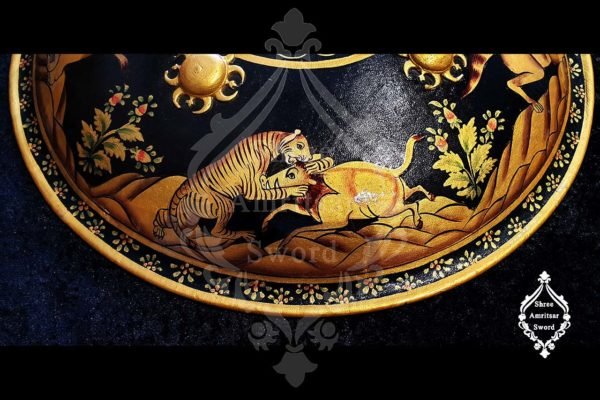 The hand-painted hunting scenes of a tiger are beautifully executed, bringing history and tradition to life. The gold-covered bosses enhance the shield’s regal charm, making it not just a defensive piece but an artistic treasure. The leather grips and cushioned back ensure a firm yet comfortable hold, reflecting the practicality of its historical use.