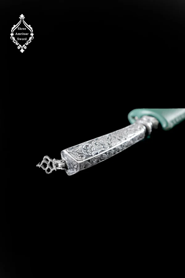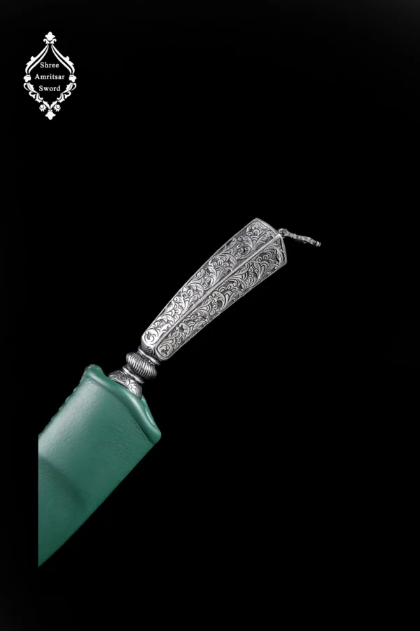 The iron hilt, crafted with intricate detailing, provides a strong and comfortable grip. Both the hilt and chape exhibit fine engraving work, enhancing the dagger’s aesthetic appeal and demonstrating the meticulous artistry of its makers. The green scabbard complements the polished steel blade, symbolizing vitality and tradition while adding a distinctive character to the weapon.