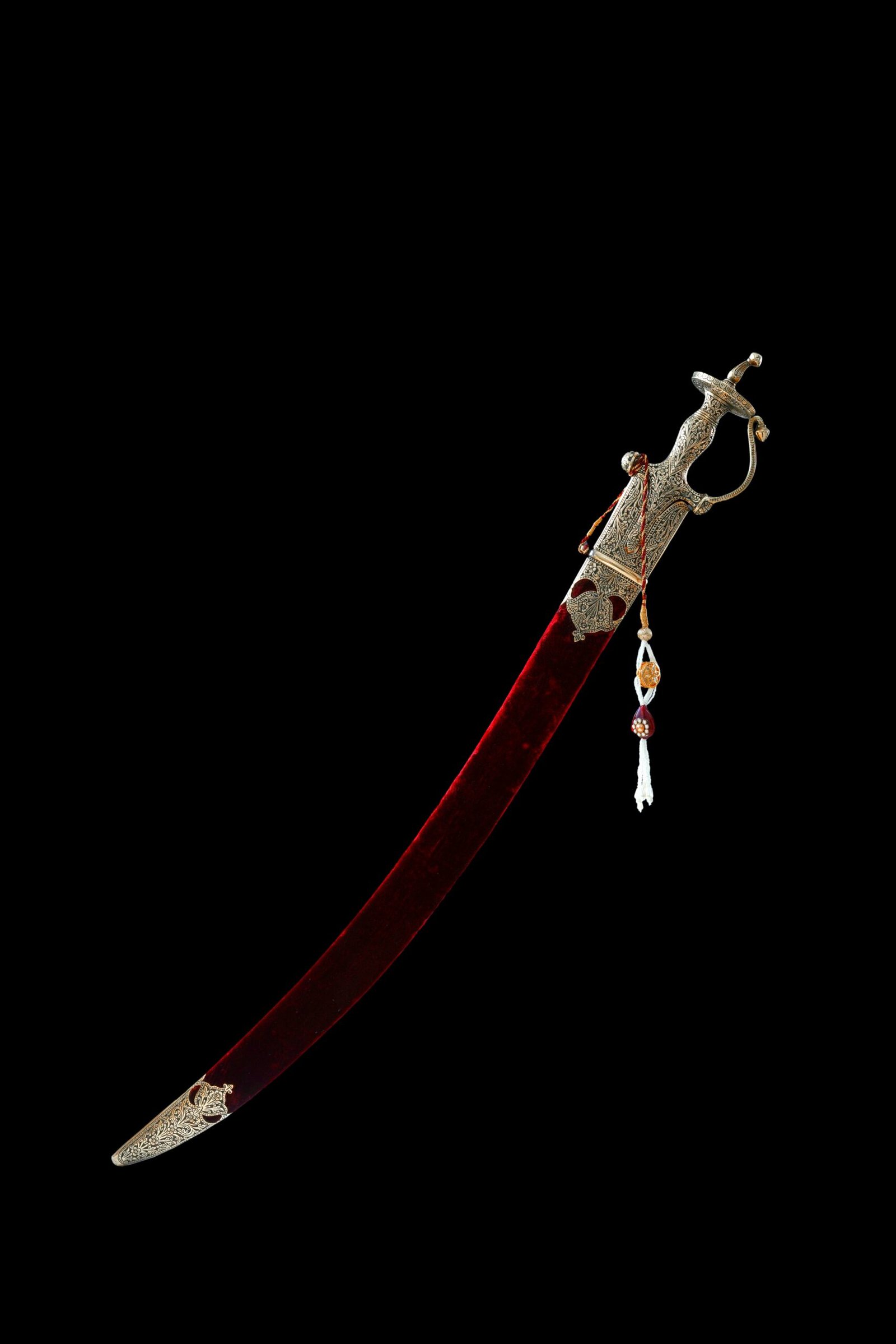 To add even more elegance, we plated the hilt, mounts, and chape with 24-karat gold. A string of pearls further elevates the scabbard, giving it a truly regal feel.