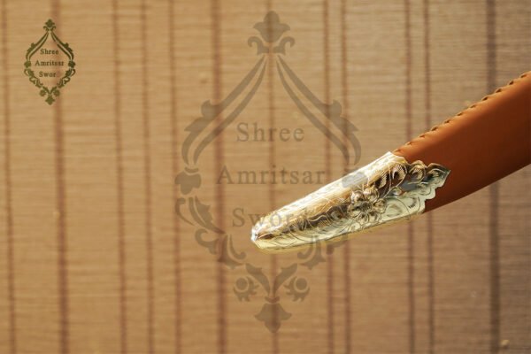 Unlike other swords, this sword has a round tip. The length of the blade is 33 inches and the total length is 38 inches. The blade is made of carbon steel, Light in weight, easy to use and best in class. The blade of this sword broadens up near the tip. One can easily fall in love with this sword. The blade is available in two types one with a broad fuller and a second with a T-back cutting. The scabbard is made of wood wrapped in genuine brown leather. The colour of the leather can be changed according to the customer’s choice. The hilt of the sword and chape are hand engraved with floral patterns. Both the hilt and the chape are made of iron with a nickel-silver coating on them. To place an order kindly fill the inquiry form.