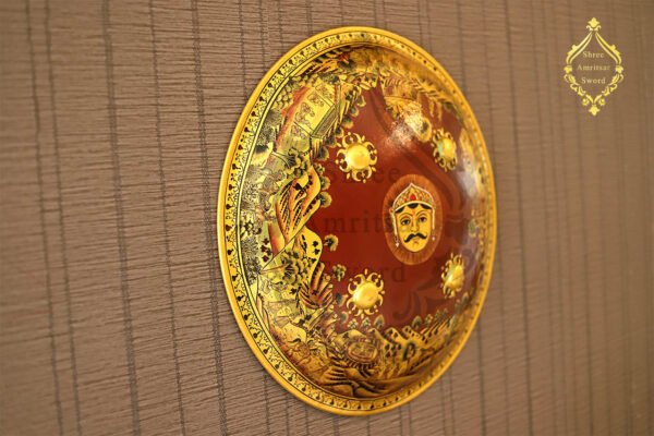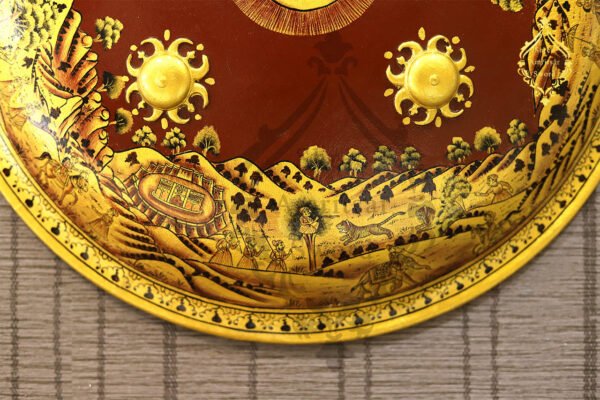 An esthetic Indian shield to decore the walls of your home, office, reception. The base of the shield is made of iron and is wrapped beautifully in genuine leather. This shield is totally hand-painted by the artisan with beautiful colors. The microwork has been beautifully encrypted. It exhibits the figures of the kings and the queens hunting in the jungle and their gatherings. A real pretty piece to hang on your wall. Every front we build is handmade using only the finest, hand-picked leather. The size of the shield is 19 inches in diameter. To place your order, fill the inquiry form today.