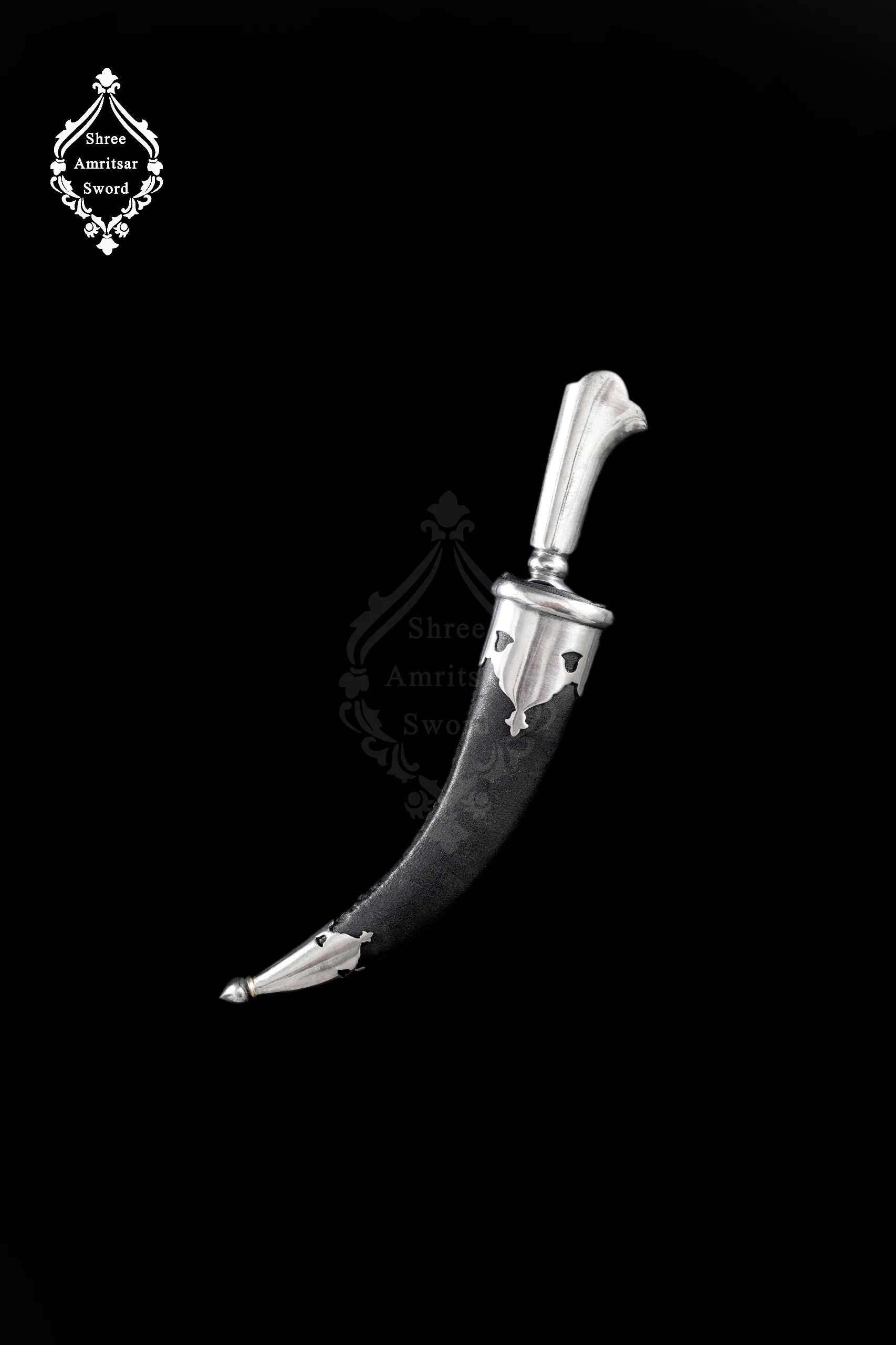 The blade is forged from High Carbon Steel (EN31), ensuring superior sharpness, durability, and resilience. With a hardness rating of 42–43 HRC, it retains its edge while providing strength and reliability. Measuring 12.5 cm in length and 2.2 cm in breadth, the blade is compact yet effective, ideal for ceremonial purposes and as a collector’s piece. The kirpan’s total length is 20 cm, extending to 23.5 cm with its black scabbard, offering a balanced and visually appealing profile.