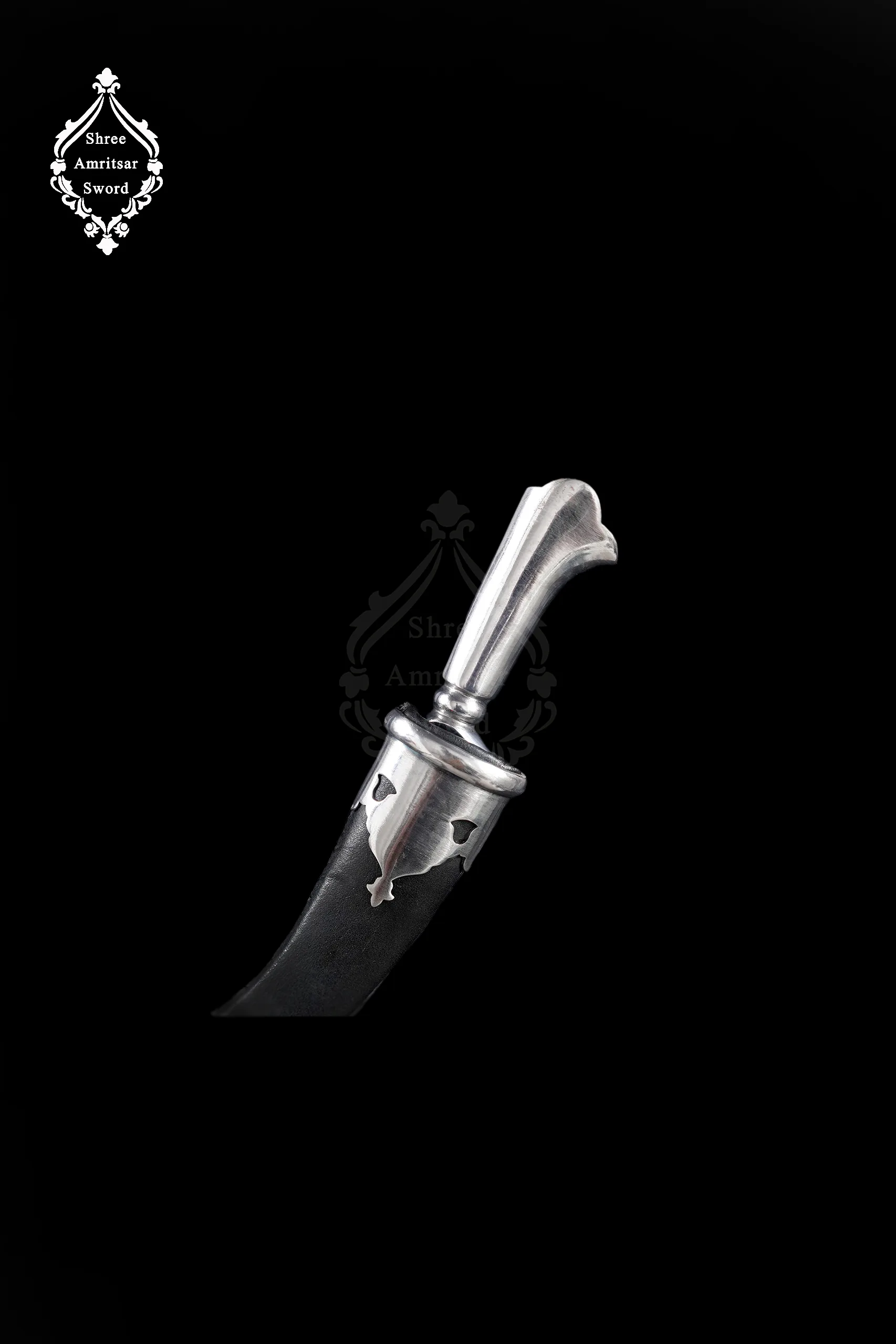 The iron hilt is ergonomically designed for a secure and comfortable grip, reflecting the traditional Sikh design that has been honored for centuries. The black scabbard complements the polished blade, providing both protection and elegance. Weighing approximately 100 gm (150 gm with sheath), each kirpan may vary slightly due to its handcrafted nature, ensuring every piece is unique.