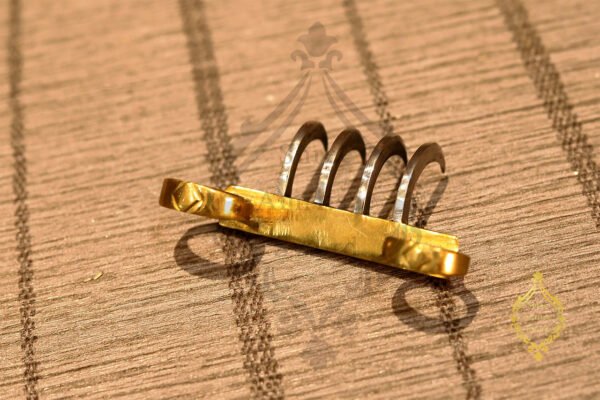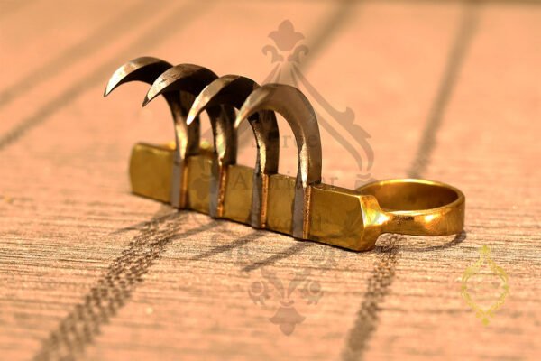 Vagh Nakha ( native name ), also known as a tiger claw. It originated from the Indian subcontinent where it is widely used by the Maratha warriors. The most well-known usage of the weapon is by the first Maratha King Chatrapati Shivaji Maharaj who used the bagh nakha to kill the Bijapur general Afzal Khan. It is also a popular weapon among the Nihang Sikhs. Who often hold one in their left hand while wielding a larger weapon such as a sword in the right hand. It is known as Sher Panja in the native Punjabi language. It’s designed to fit over the knuckles or be concealed under and against the palm. This bagh nakha consists of four curved blades affixed to a crossbar or glove and is designed to slash through skin and muscle. The claws of this vagh nakha are made of carbon steel, the crossbar and the rings are made of brass.